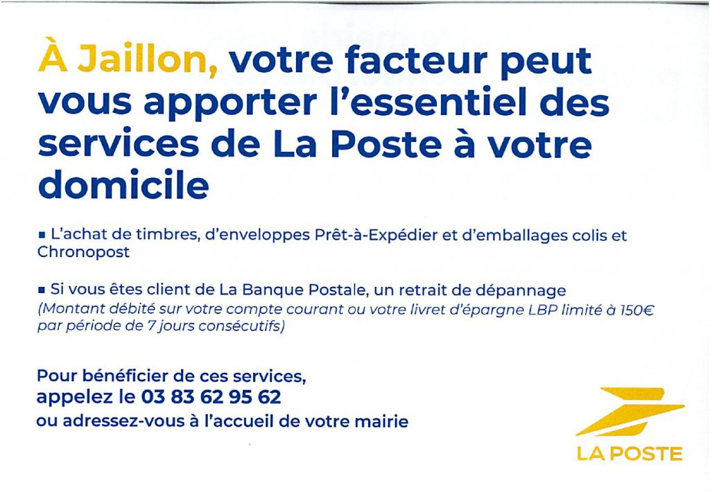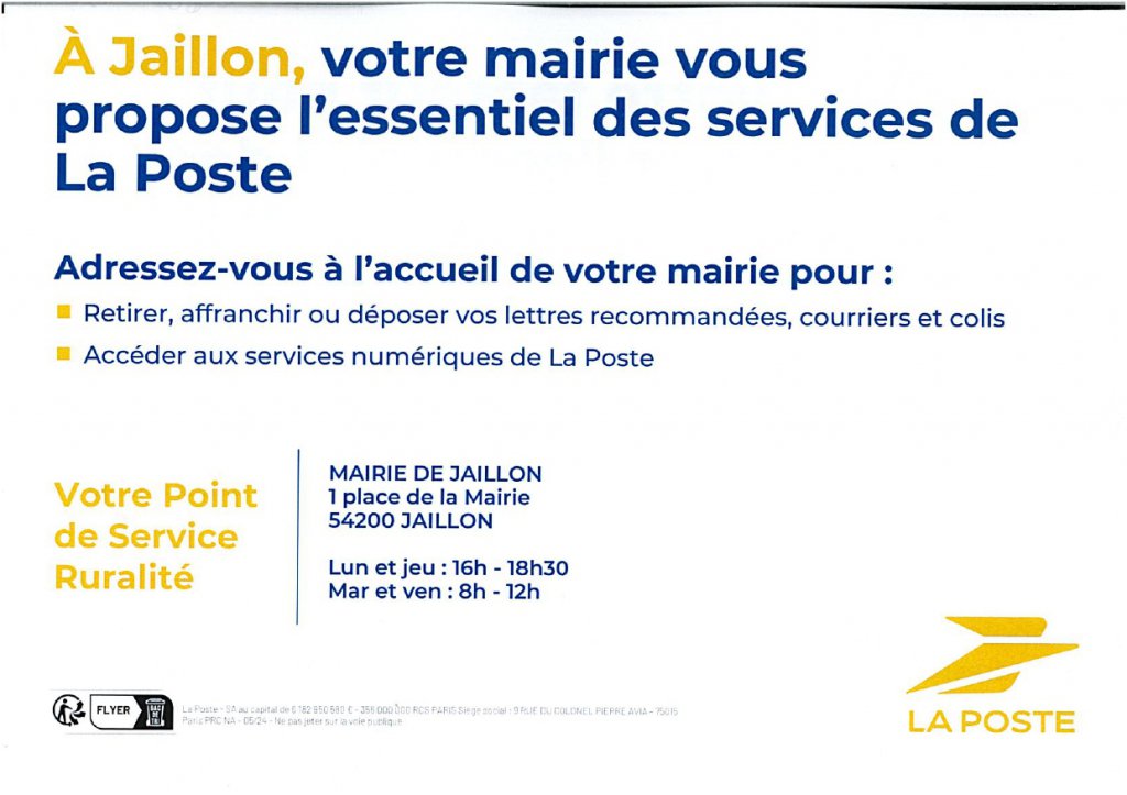 Ouverture d'un point service ruralité " LA POSTE" au sein de la mairie de Jaillon. Ce service est ouvert depuis le 25 septembre 2025.
